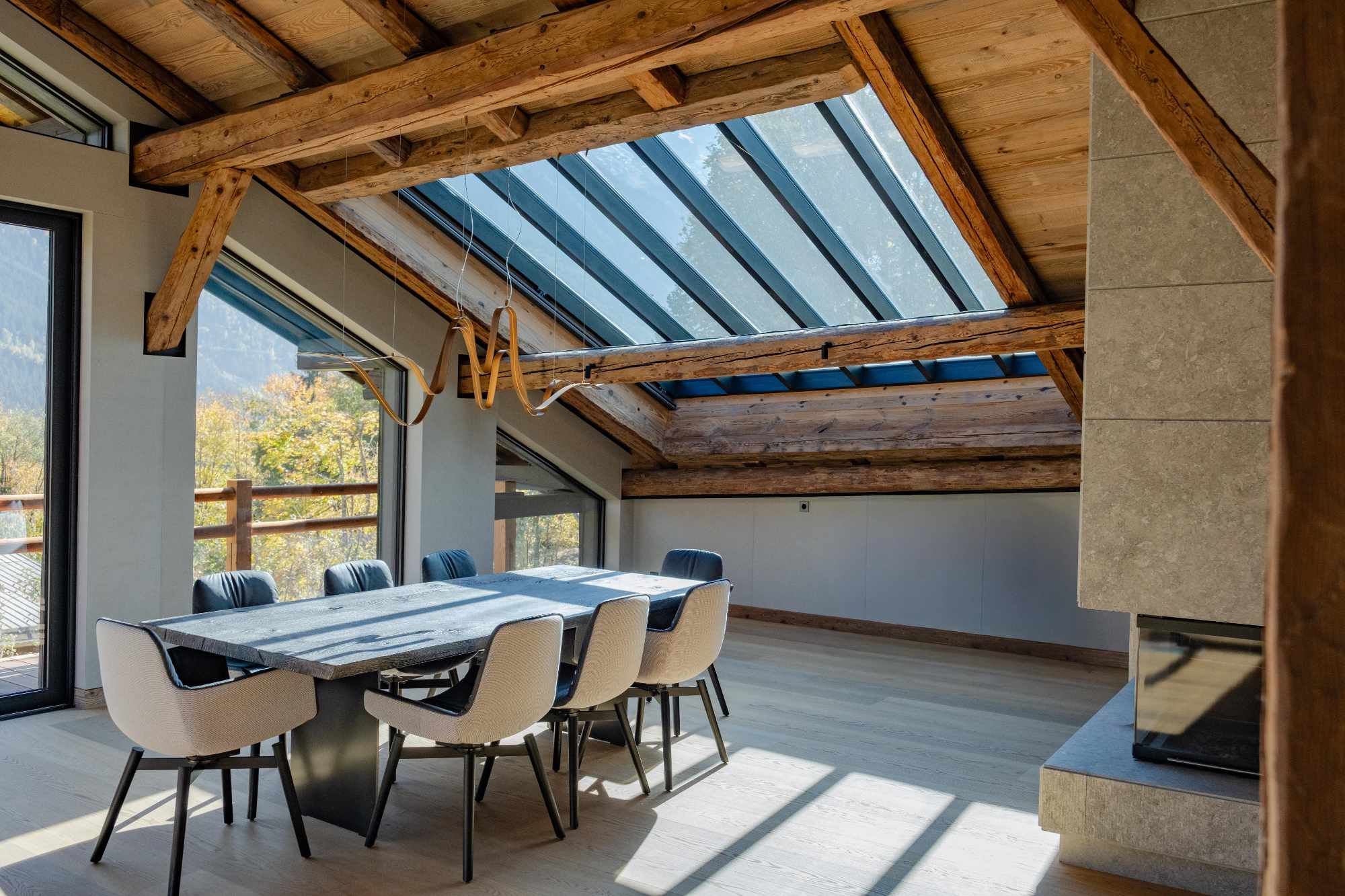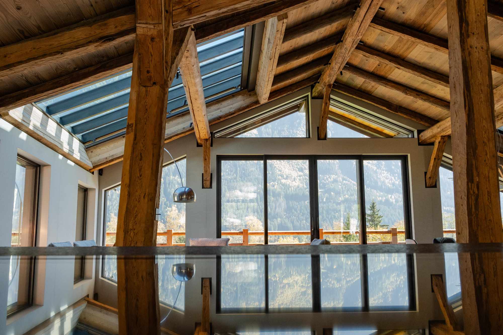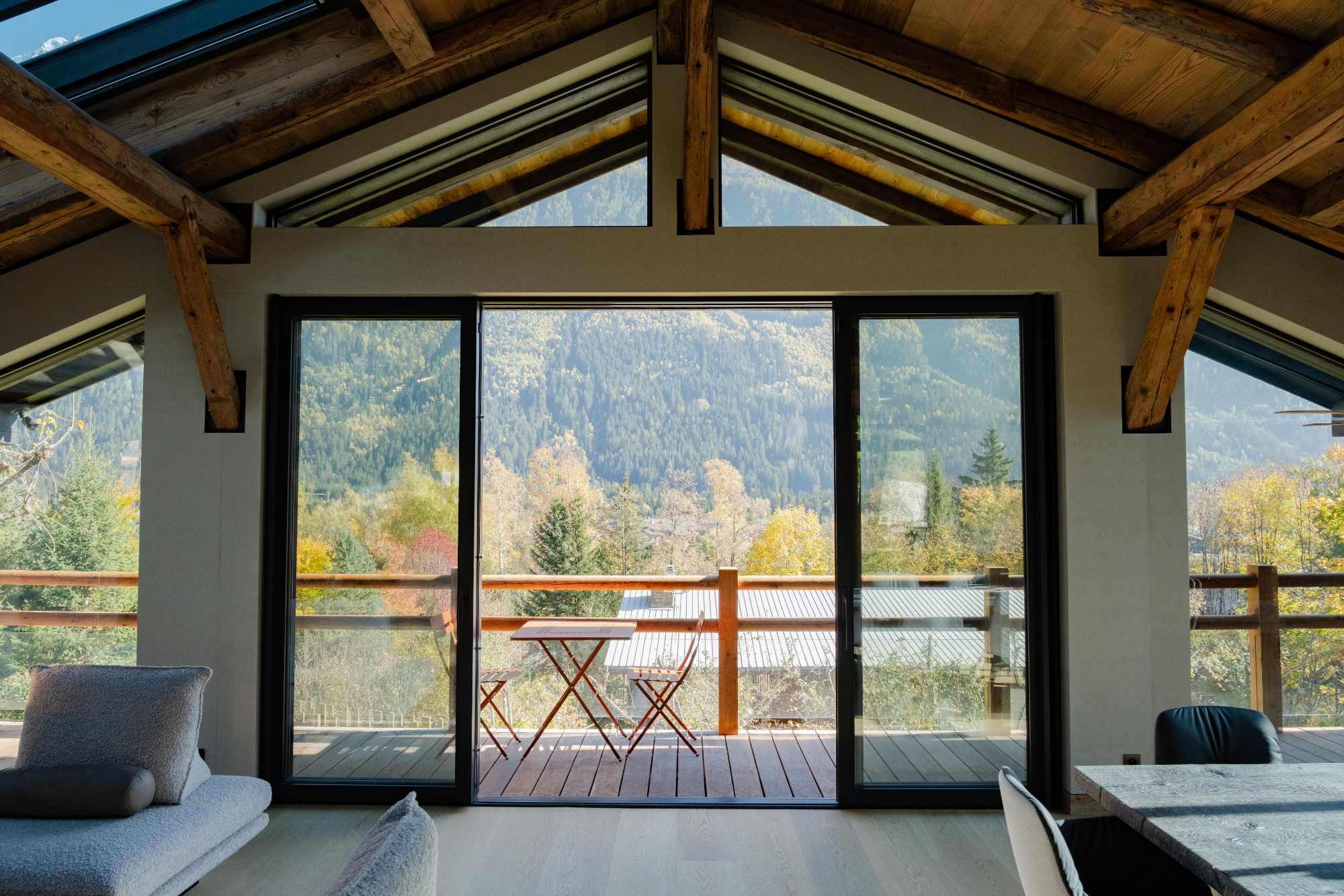 L’un des objectifs majeurs de la rénovation était de tirer pleinement parti de la situation exceptionnelle de la ferme. L’architecture a été repensée pour favoriser les cadrages de vue. De nouvelles belles et grandes ouvertures stratégiquement placées et de larges baies vitrées invitent l’incroyable panorama chamoniard à devenir une composante à part entière du décor, fusionnant l’intérieur chaleureux du chalet avec la splendeur brute de la montagne.