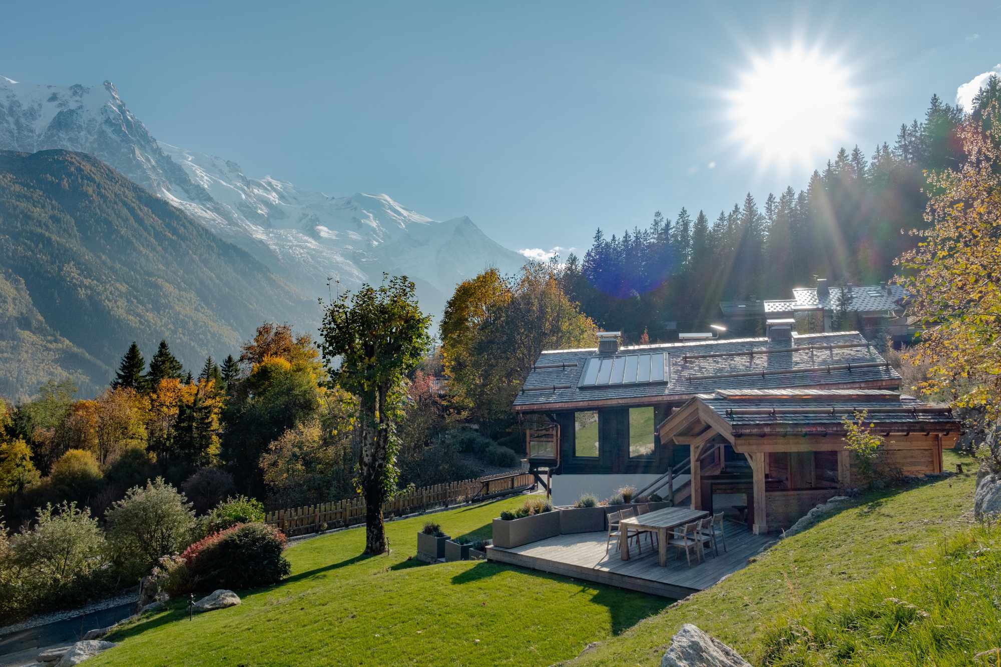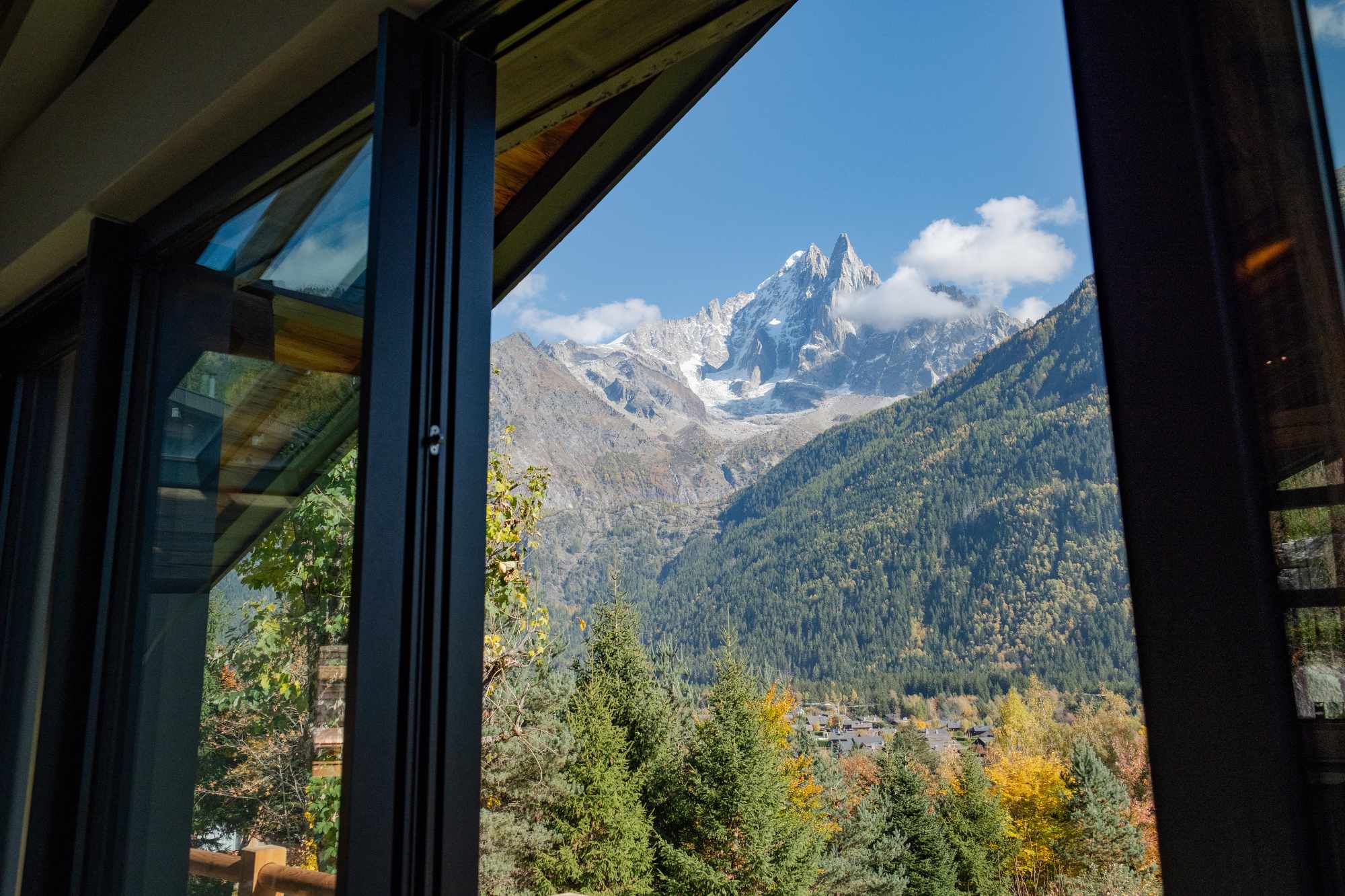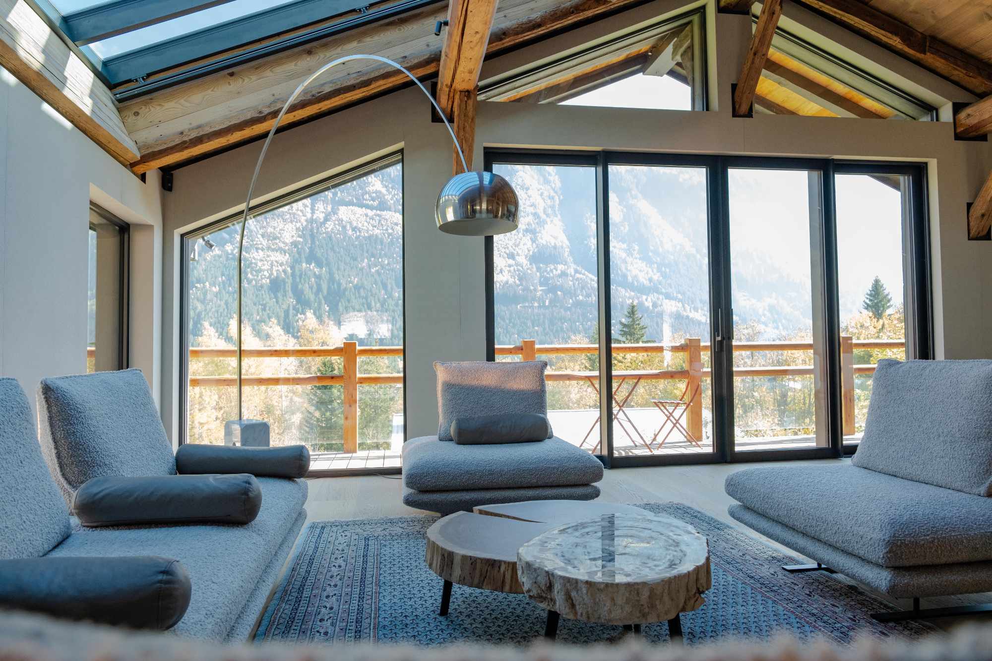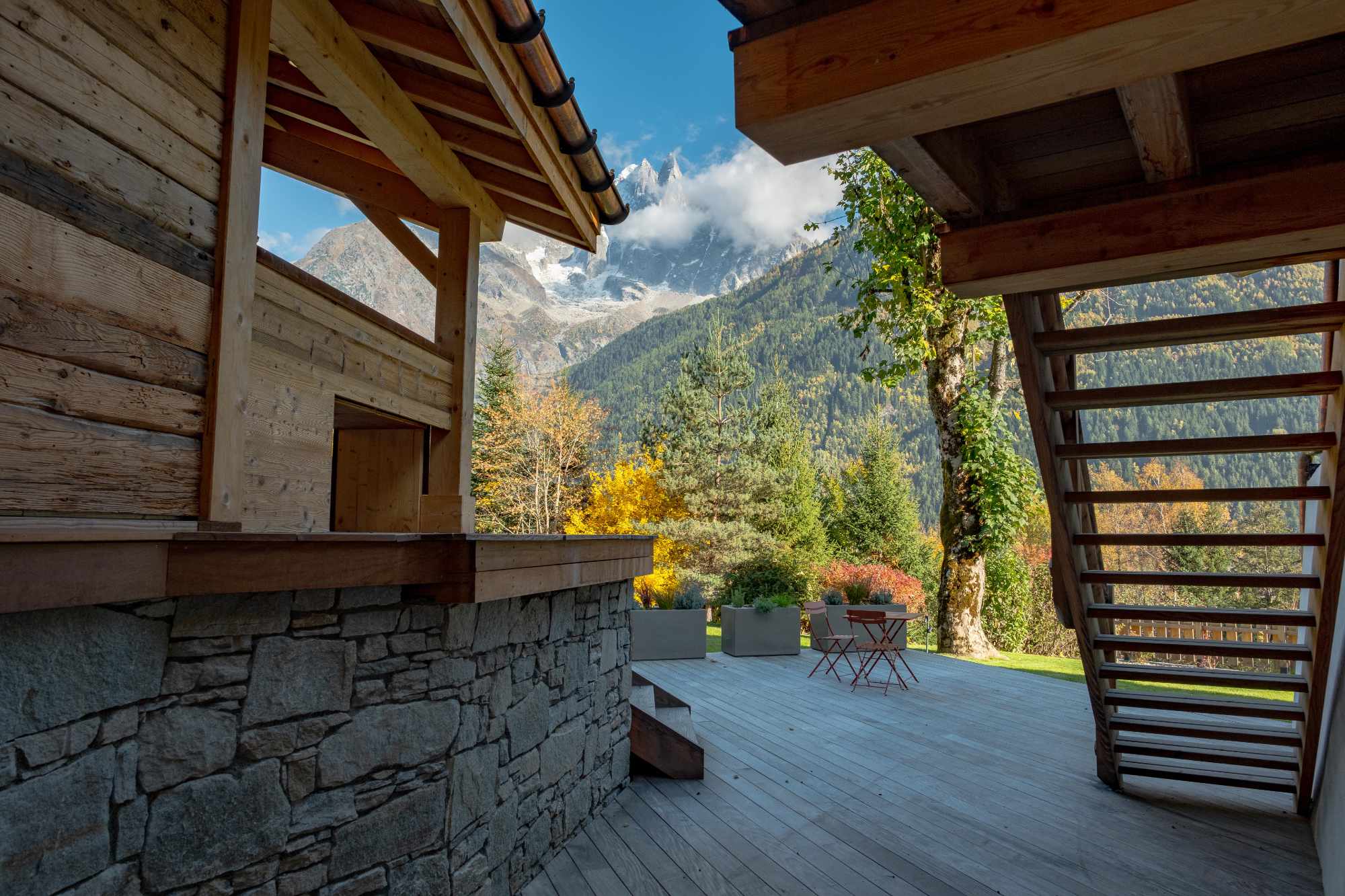 L’un des objectifs majeurs de la rénovation était de tirer pleinement parti de la situation exceptionnelle de la ferme. L’architecture a été repensée pour favoriser les cadrages de vue. De nouvelles belles et grandes ouvertures stratégiquement placées et de larges baies vitrées invitent l’incroyable panorama chamoniard à devenir une composante à part entière du décor, fusionnant l’intérieur chaleureux du chalet avec la splendeur brute de la montagne.
