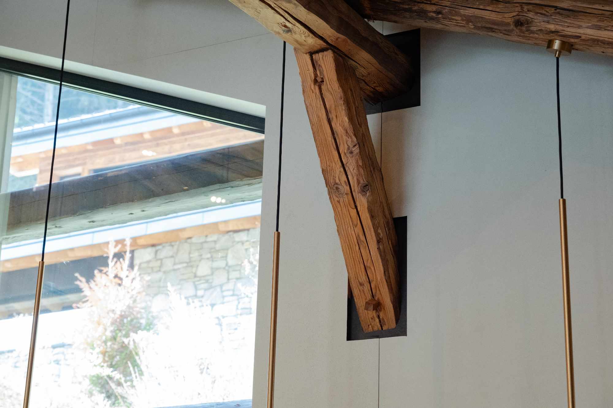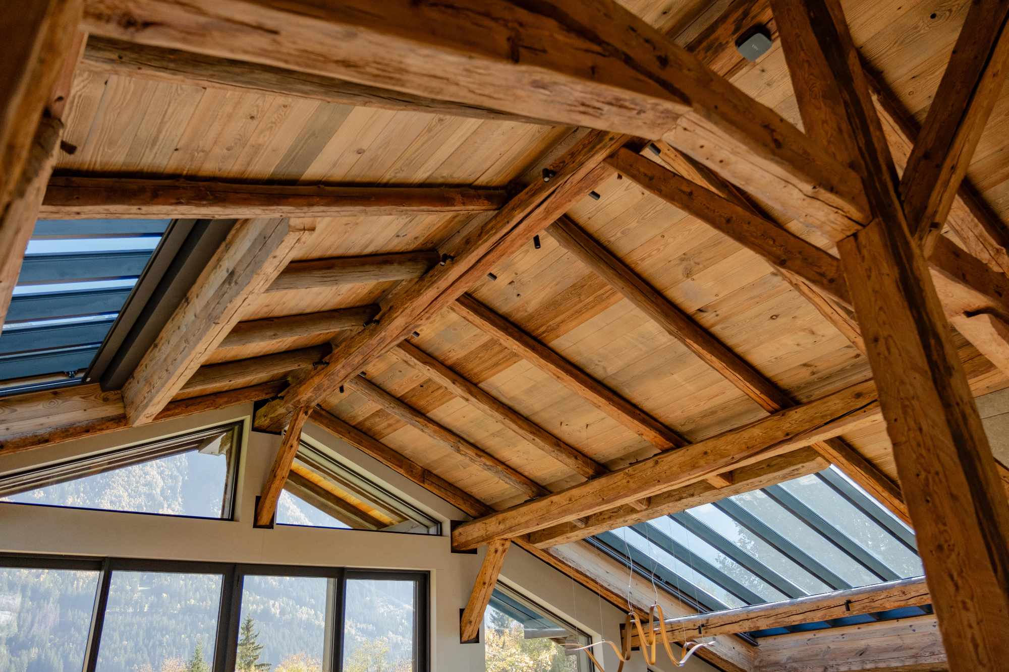 Un élément fort du projet réside dans une décision radicale : Préserver et sublimer la charpente originale. Plutôt que de masquer les marques du temps, les poutres noueuses et tordues, témoins de plus de deux siècles d’histoire, ont été intégralement conservées et mises en lumière.